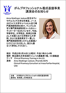 本学では、がんプロフェッショナル基盤養成事業として、「がん専門薬剤師」の養成を目的とした大学院教育システムの構築を目指しています。日本における「がん専門薬剤師」養成の大学院教育システムを考える際に、米国で先行している学部から大学院、そして卒後教育まで一貫した専門薬剤師教育システムについて学ぶ意義は大きいです。このような観点から、今回、米国大学研修病院で専門薬剤師教育システム担当Jackson先生を招き米国の教育システムを学ぶ機会を企画しました。